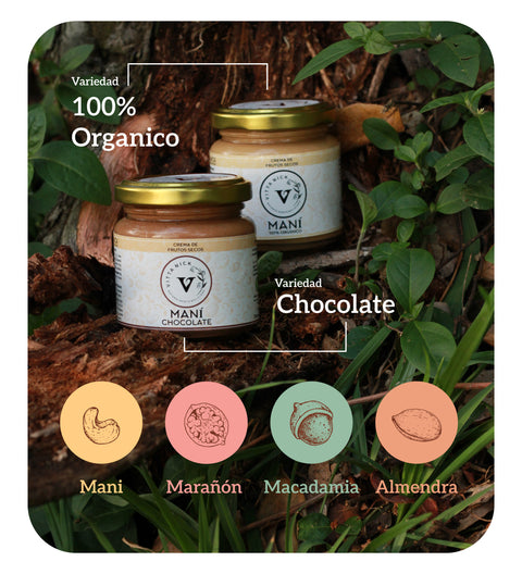 Nuestras cremas esparcibles de frutos secos están disponibles en 4 sabores irresistibles: maní, macadamia, marañón y almendra. Cada sabor tiene 2 variedades únicas para elegir: 100% natural o con un toque de chocolate.